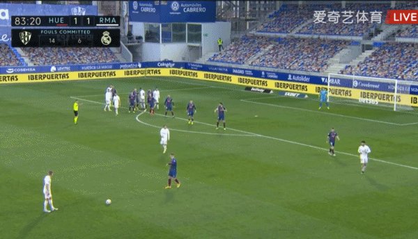 48'韦斯卡右路发起快攻,冈崎慎司横传到远端,哈维·加兰左脚爆射破门,韦斯卡1-0主场领先皇马!